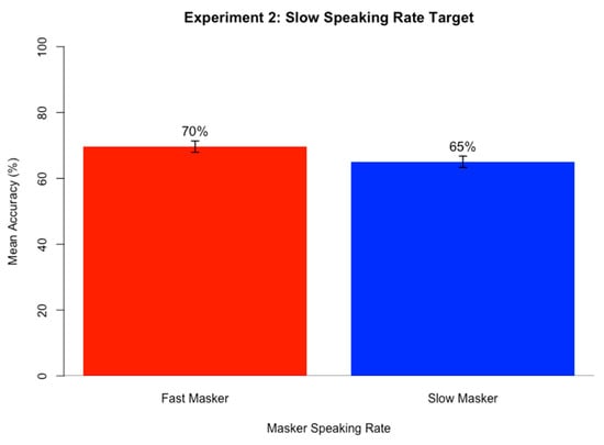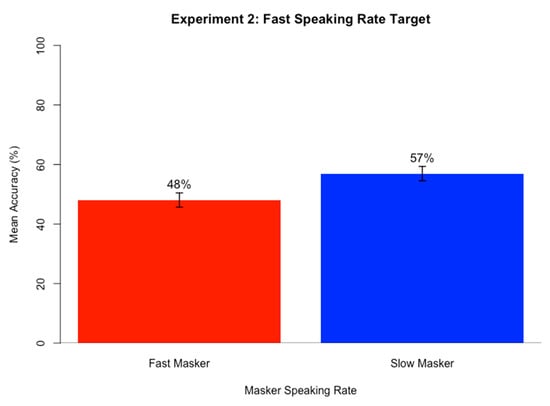While the role of f0 has been studied in competing speech perception, little research has identified the role of speaking rate in masker effectiveness. Calandruccio et al. [] indirectly investigated the role of speaking rate in competing speech perception by testing the perception of English clear and conversational target speech within English and Croatian clear and conversational masker speech. Due to the slower speaking rate of clear speech compared to conversational speech, this study partially tests the role of speaking rate, although other acoustic differences exist between clear and conversational speech beyond just speaking rate (such as differences in vowel reduction, consistency in release of stop bursts, and RMS intensity for obstruent sounds []), meaning any findings of the study cannot be exclusively attributed to speaking rate. Participants in the experiment listened to female target speech spoken in either conversational or clear speaking style within female two-talker masker babble composed of either English clear speech, English conversational speech, Croatian clear speech, or Croatian conversational speech. Participants were not familiar with Croatian. Accuracy scores in a sentence repetition task in which participants were supposed to repeat aloud what the target speaker just said indicated that while clear target speech has an expected perceptual advantage over conversational target speech, masker speaking style (clear versus conversational) did not influence masker effectiveness. While these data suggest slower speaking rates in clear speech may improve intelligibility of target speech during competing speech perception, the clear speech benefit may not only be attributed to speaking rate given other potential acoustic differences between clear and conversational speech.