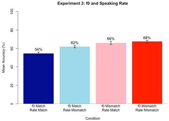 When comparing accuracy scores between Speaking Rate Match and Mismatch conditions for the subset of data with matching f0 values between target and masker speech, there was significantly higher accuracy for Speaking Rate Mismatch conditions. In contrast, there was no significant difference in accuracy scores depending on speaking rate properties. This indicates that speaking rate differences between target and masker speech only seem to matter when f0 cues do not contribute and conflict.