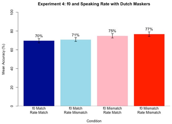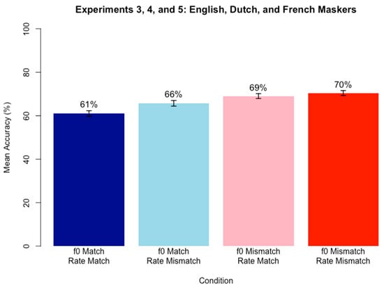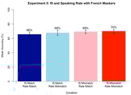 Experiment 5 replicated Experiment 3, except with French masker speech instead of English masker speech. The goal of this experiment was to identify whether a different unknown language masker with rhythm properties that differ more between target and masker speech would still cause participants to use f0 and speaking rate in the same way, with particular focus on how speaking rate’s influence may differ for languages of different rhythm classes. The results, however, demonstrated no significant effects, meaning neither the f0 nor the speaking rate of the stimuli predicted performance on the task. While no significant effects were found, results again numerically offered some evidence in favor of the target-masker linguistic similarity hypothesis [], with accuracy highest for the most distinct target-masker pairs (f0 and speaking rate both mismatching) and accuracy lowest for the most similar target-masker pairs (f0 and speaking rate both matching).