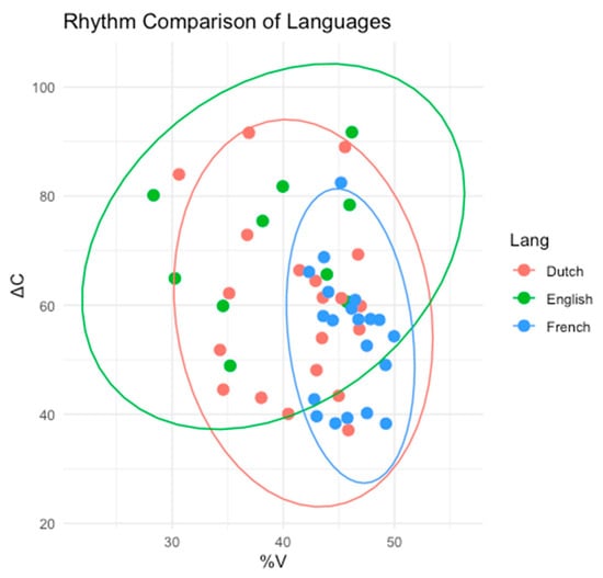 For the languages of the current study (English, Dutch, and French), previous research largely points to English and Dutch sharing properties traditionally corresponding to stress-timed languages, while French has properties traditionally corresponding to syllable-timed languages. Ramus et al. [] found that when plotting the proportion of vocalic intervals and the average standard deviation of consonantal intervals, English and Dutch clustered together, while French was plotted in a different cluster farther away, suggesting that English and Dutch belong to a different rhythm class from French. Similarly, when studying prominence features across languages, Dutch and English share similar prosodic structures [] and have lexical stress [,], while French uses prosody differently when cueing focus [] and has phrasal prominence instead of lexical stress []. Overall, given these characteristics of English, Dutch, and French rhythm and prominence, English and Dutch share many similarities that are distinct from French. For the purposes of the present study, the terms stress-timed (for English and Dutch) and syllable-timed (for French) will be used to represent these differences between languages, although it should be noted that these terms are not agreed upon by all researchers.