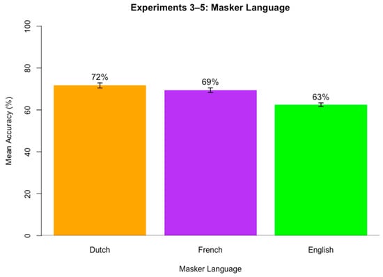 Experiments 4 (Dutch masker speech) and 5 (French masker speech) were also compared. This analysis found no effect of Language (Language did not remain after backwards fitting the model), indicating that while participants experienced greater accuracy for unknown masker speech (either Dutch or French) compared to known masker speech (English), the actual masker language itself did not matter.