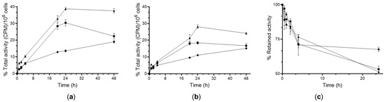 Cellular uptake (a), internalization (b) and efflux (c) of [64Cu]Cu-NOTA-TP-c(RGDfK) (black triangle) in comparison with [64Cu]Cu-NOTA-TP (black square) and [64Cu]Cu-NOTA-c(RGDfK) (black circle) in human U87 MG cell line expressing integrin-αvβ3. Cellular uptake and internalization are presented as % of total activity (CPM)/106 cells. Efflux is expressed as the percentage of retained activity at t = 0, when the radioactive media was removed.