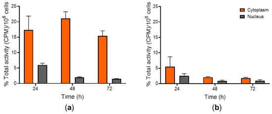 The nucleus and cytoplasm of U87 MG and SVG p12 cells were extracted following established procedures as previously reported []. U87 MG and SVG p12 cells were treated with 1 MBq of [64Cu]Cu-NOTA-TP-c(RGDfK) for 24, 48, and 72 h. After incubation, cells were washed and incubated on ice with CSK buffer (0.5% Triton X-100, 300 mM sucrose, 100 mM NaCl, 1 mM EDTA, 2 mM MgCl2, and 10 mM HEPES, pH 6.8) for 2 min. After 5 min centrifugation, supernatant containing cytoplasmic extract was collected and transferred in labeled tubes. The resulting pellets were incubated on ice for 2 min with CSK buffer without Triton X-100 to extract the nuclear fraction. The buffer containing the nuclear fraction was collected into separate tubes. The radioactivity in both cytoplasmic and nuclear fractions was measured using a gamma counter (HIDEX Automatic Gamma Counter 2014).