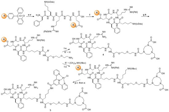 c(RGDfK) peptides 4 and 5 were synthesized via solid-phase peptide synthesis protocols using commercially available 2-chlorotrityl chloride resin (loading capacity: 0.8 mmol/g), Scheme 1. HATU was employed as the coupling reagent, and Fmoc-amino acids were used. Prior to synthesis, the resin was swollen 30 min in DCM []. The synthesis began with the attachment of Fmoc–Asp(OAll)–OH (2 equivalents (equiv)) to the resin in the presence of N,N-diisopropylethylamine (DIPEA, 4 equiv) in DCM for 4 h. Fmoc deprotection was carried out by treating the resin with 20% piperidine in DMF for three cycles of 10 min each. The subsequent four amino acids—Fmoc–Gly–OH, Fmoc–Arg(Pbf)–OH, Fmoc–Lys(ivDde)–OH, and Fmoc–D-Phe–OH—were coupled sequentially using 5 equiv of each Fmoc-amino acid, activated in situ with HATU (5 equiv) and DIPEA (10 equiv) in DMF, with each coupling allowed to proceed for 3 h. Coupling efficiency at each step was monitored using the Kaiser test. After each reaction, the resin was thoroughly washed with DMF, DCM and MeOH. Before the final Fmoc deprotection, the selective removal of the allyl protecting group from the α-carboxyl of Asp was achieved by treating the peptidyl resin with phenylsilane (PhSiH3, 24 equiv) and tetrakis(triphenylphosphine)palladium(0) (Pd(PPh3)4, 0.25 equiv) in DCM for 3 h. This was followed by washes using a DIPEA:DMF solution (5:95) and a solution of sodium diethyldithiocarbamate in DMF to remove palladium residues.