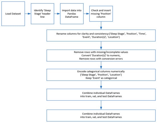 The dataset preprocessing script begins with a method to load text files from the train, validation, and test directories. The script looks for the “Sleep Stage” header line to find the start of important data within each file after opening it. The data gets imported into a Pandas DataFrame by assuming tab separated values after its identification. The script checks the existence of the “Position” column to ensure consistency before proceeding. A placeholder column receives NaN values when the “Position” column is absent from the data. The script renames all columns to Sleep Stage, Position, Time [hh:mm:ss], Event, Duration[s], and Location for better readability and consistency. The data quality is preserved through strict removal of rows that contain any missing or incomplete values. The “Duration[s]” column receives an explicit conversion to numerical format followed by removal of rows that failed conversion to ensure numeric consistency. The model training process requires numerical encoding for the categorical variables Sleep Stage, Position, and Location after data cleaning. The “Event” column remains in its categorical format because it serves classification needs (refer to Figure 1). The CAP Sleep Database underwent thorough preprocessing to verify complete data entries. The dataset eliminated all rows that contained missing or incomplete information in the Sleep Stage, Event Duration, or Time columns. The preprocessing step included explicit conversion and validation of non-numeric or malformed entries found in the Duration[s] column. The model training required exclusion of records that failed type conversion or lacked essential metadata to preserve dataset integrity and prevent model training on unreliable or noisy samples. The final dataset contained only high-quality samples that were fully populated.