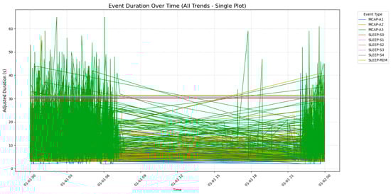 Event duration over time for different sleep stages and CAP phases, illustrating the transitions and durations of sleep stages (SLEEP-S0 to SLEEP-S4, SLEEP-REM) and CAP phases (MCAP-A1 to MCAP-A3) over a 24 h period.