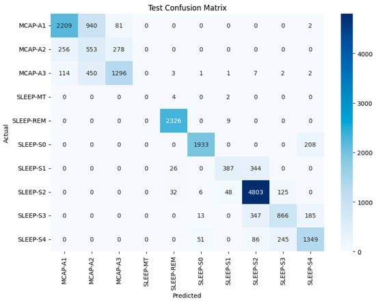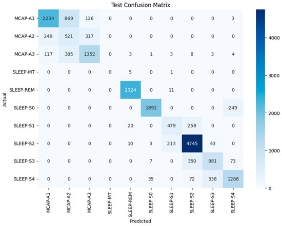 The PSO algorithm was used to optimize hyperparameters for better model performance. The PSO-based tuning results in the confusion matrix are presented in Figure 5, which shows multiple class improvements. The number of MCAP-A1 misclassifications into A2 decreased from 940 to 869, and SLEEP-S2 classification improved, with 4745 correct predictions out of 5015. The classification of SLEEP-S4 improved relative to SLEEP-S3, and confusion between SLEEP-S1 and SLEEP-S2 decreased. The remaining confusion between MCAP-A2 and MCAP-A3 persisted together with the overlapping stages of deeper non-REM sleep. The results show that optimization improved accuracy and reduced some of the earlier confusion patterns, but architectural improvements or feature expansion may be needed to fully resolve the limitations in class separability (Refer to Table 2).