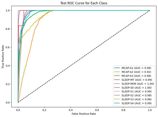 Figure 6 shows the ROC curves for the PSO-optimized model. The model maintained or improved its performance across all classes. The AUC scores of SLEEP-MT, SLEEP-REM, and SLEEP-S0 remained unchanged. SLEEP-S1 reached 0.99, and SLEEP-S3 achieved 0.97. The MCAP-A2 class showed the most problematic performance because its AUC score remained at 0.92 despite the improvements made. The results confirm the model’s ability to distinguish well-defined sleep stages and highlight the inherent difficulties of identifying stages with overlapping spectral or temporal characteristics.