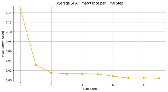 The limited AUC improvement observed after PSO optimization can be attributed to the relatively large and well-annotated dataset, which enabled strong baseline performance. The model had sufficient training samples and high inter-class separability, so it had less room for optimization gains, though improvements in borderline classes like SLEEP-S3 remain clinically meaningful. The model achieved raw classification metrics, but interpretability was introduced through SHAP analysis. The model’s internal decision-making process was analyzed through three SHAP visualization forms, which included temporal relevance, feature attribution, and a heatmap that combined both. The average SHAP values per time step in Figure 7 show that the model mainly concentrated on the initial part of each sequence. The SHAP values at time step 0 were substantially greater than those at other time steps, indicating that the first signal segments contained the most important features. The observed finding matches physiological reality because sleep stage transitions and sudden arousal events typically appeared as abrupt shifts during the initial part of the signal window.