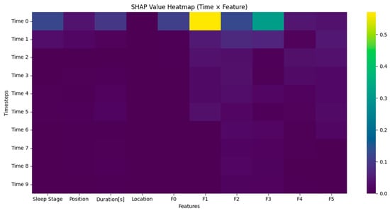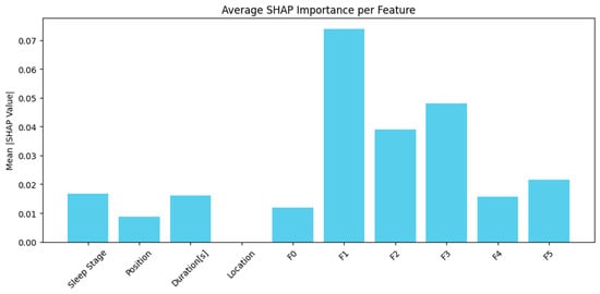 The SHAP values in Figure 8 were combined across time to identify which features most affected predictions. The model used engineered signal features F1, F2, and F3 together with duration-based metadata. F1 demonstrated the greatest mean SHAP value among them, while F3 and F2 ranked second and third, respectively. The “Duration[s]” and “Sleep Stage” metadata provided significant value, while positional data provided relatively less value. The model obtained its most helpful information from frequency- or morphology-based features, possibly encoding delta, theta, or alpha power that characterizes specific sleep stages. The importance of duration as a feature was expected, as the length of sleep events can indicate stage transitions or stable periods.