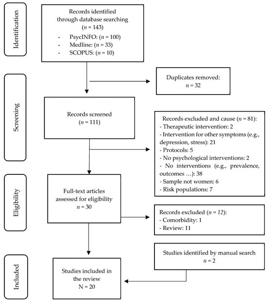 A systematic search was then carried out in which the retrieved studies were screened. A series of inclusion and exclusion criteria were applied to guide the selection process. After reading the title and abstract of the studies, the investigators excluded a total of 81 studies for (1) being therapeutic interventions, i.e., for women who met the criteria for a mental disorder; (2) being interventions aimed at other symptomatology (e.g., depression, stress, distress); (3) being protocols; (4) not being psychological interventions; (5) addressing aspects other than an intervention (e.g., prevalence, consequences); (6) not being psychological interventions; (7) addressing aspects other than an intervention (e.g., prevalence, consequences); (8) not being psychological interventions; and (9) not addressing aspects other than an intervention (e.g., prevalence, consequences); (10) the sample was not women; and (11) they were at-risk populations (e.g., low-income women, battered women, etc.).
