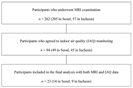 This pilot cross-sectional study was conducted as part of the Environmental Pollution-Induced Neurological Effects (EPINEF) project to explore the potential impact of environmental pollution on brain structure among community-dwelling older adults aged 65 years or older. Participants were initially recruited from two metropolitan areas in Korea (Seoul and Incheon) through voluntary participation in a brain magnetic resonance imaging (MRI) examination [32,33]. Among 262 individuals who underwent MRI (205 in Seoul and 57 in Incheon), 94 agreed to participate in additional indoor air quality (IAQ) monitoring [34,35] in accordance with the Ministry of Environment’s official test method for indoor air quality [36]. Of these, 23 participants (14 from Seoul and 9 from Incheon) who were able to install IoT-based air quality monitoring equipment in their homes for at least two months were included in the final analysis (Figure 1). As this was a pilot study, the final sample size was primarily determined based on feasibility. This study was approved by the Institutional Review Board of the Yonsei University Health System (Approval No. 4-2022-0418).