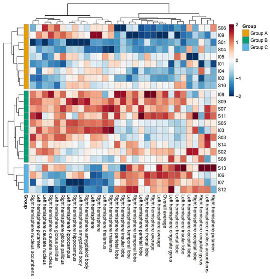 Hierarchical clustering was performed after removing the effects of 10 individual characteristics (e.g., height, weight, gender, and education level). This analysis identified three distinct clusters—Groups A, B, and C—which were characterized by different combinations of neuroanatomical features, including cortical thickness, cortical surface area, and subcortical volume (Figure 2). Of the 23 participants, Groups A, B, and C comprised 9 (39.1%), 10 (43.5%), and 4 (17.4%) individuals, respectively.