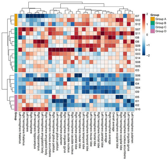 A second clustering analysis was conducted after additionally adjusting for total intracranial volume (eTIV), in combination with the original 10 individual characteristics. This resulted in four groups—Groups A, B, C, and D—each reflecting distinct profiles driven primarily by variations in cortical thickness, subcortical volume, cortical surface area, and a combination of surface area and volume, respectively (Figure 3). The number of participants in Groups A, B, C, and D were 3 (13.0%), 11 (47.8%), 5 (21.7%), and 4 (17.4%), respectively.