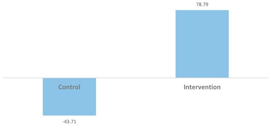 Mean difference in values (minutes) representing changes in moderate physical activity in a typical week from pre-intervention to post-intervention in the two study conditions.
