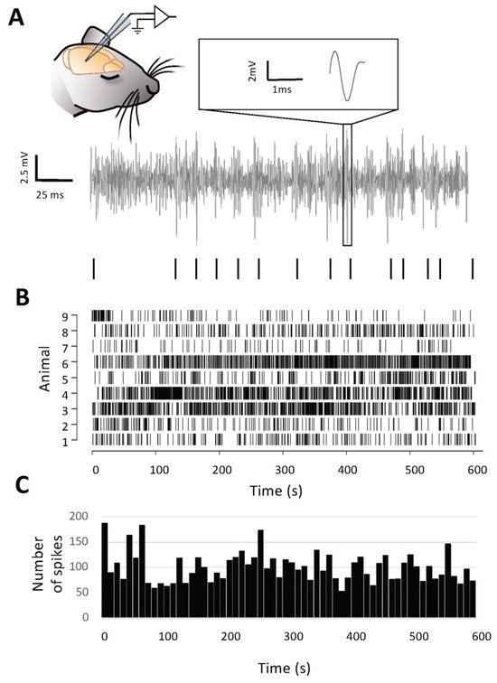 Extracellular in vivo recording of neuronal activity. (A). In vivo extracellular recording of cortical neuronal spiking. Representative extracellular unit recording trace of spontaneous neuronal spiking activity. The occurrence of spikes is depicted by short black bars underneath the trace. (B). Raster plot of neuronal spiking recorded in 9 mice over 10 min. (C). Spiking rate obtained by cumulating the number of spikes per bin of 10 s from the raster plot.