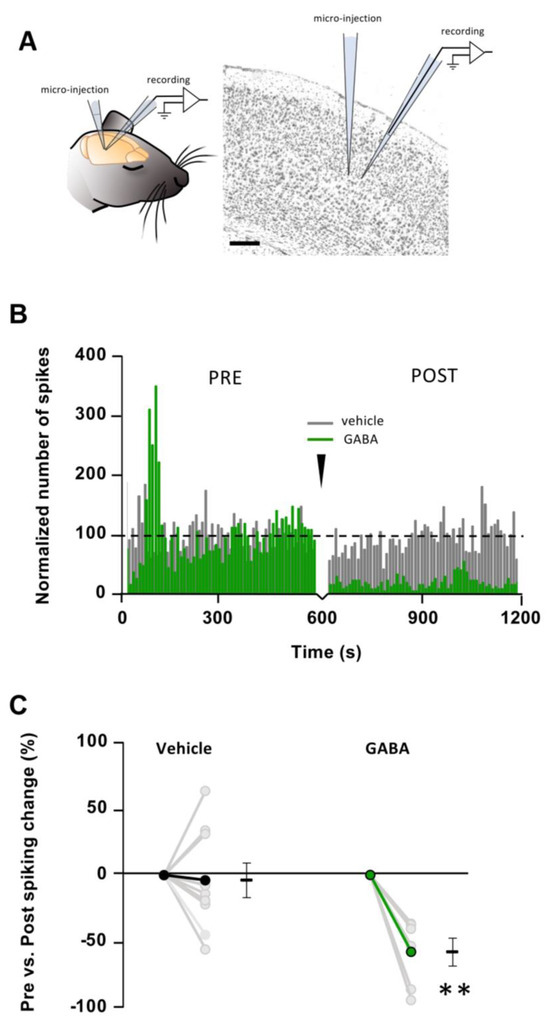 Controls: effects of vehicle and GABA on cortical spiking rate. (A). Experimental arrangement showing the double implantation of pipettes for micro-injection of ODN in the vicinity (~50 μm) of the recording pipette (layer 4; scale bar: 100 μm). (B). Effect of the micro-injection of vehicle (gray line) or GABA (green line) on neuronal spiking rate (Black arrowhead marks the onset of the microinjection). Overall, spiking rate was stable, and not influenced by the administration procedure. Neurons answered to GABA (200 μM) by a strong reduction in their activity. (C). Spiking rate change per animal and average. Vehicle: PRE vs. POST, p > 0.05; n = 9 mice. GABA: PRE vs. POST, p < 0.01 (**); n = 6 mice.