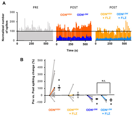 Bi-directional effect of the gliopeptide ODN on neuronal spiking. (A). Effects of the micro-injection of ODN at high concentration (10−5 M; ODNHigh) without and with flumazenil (FLZ) or at low concentration (10−11 M; ODNLow) on neuronal spiking rate. (B). Spiking rate change per animal and average for each condition. ODNHigh: PRE vs. POST p < 0.05; n = 19 mice. This effect was abolished with flumazenil (n = 5 mice; PRE vs. POST, p > 0.05). ODNLow: PRE vs. POST, p < 0.05; n = 8 mice. This effect was insensitive to flumazenil (PRE vs. POST, p < 0.05; n = 5 mice). Stars (*) indicate a significant difference in spiking rate compared to the “PRE” condition (10 min baseline). N.S.: not significant.