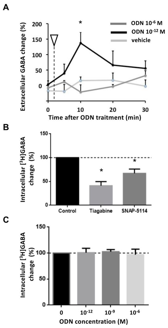 Finally, to address the possibility that ODN modifies astrocytic GABA uptake, we used a radio-assay to quantify the intracellular accumulation of [3H]GABA. The uptake of [3H]GABA in the presence of the selective GAT-1 inhibitor tiagabine (50 μM) or the selective GAT-3 inhibitor SNAP 5114 (30 μM) was significantly reduced by 59 ± 9% and 33 ± 9%, respectively (n = 6 and n = 3, respectively; p < 0.05; Figure 4B) relative to the total uptake over 30 min in the control condition. However, ODN failed to modify the transport of [3H]GABA into astrocytes for the three concentrations of ODN tested, 10−6, 10−9, and 10−12 M, (n = 4; n = 6; n = 3, respectively; p > 0.05; Figure 4C).