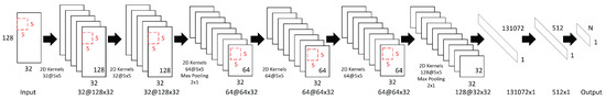 The architecture of the convolutional neural network model consists of six convolutional layers interleaved with two max-pooling layers, followed by two fully connected layers. The overall architecture of the network is illustrated in Figure 1, while detailed layer configurations, including output sizes, kernel sizes, number of filters (units), and stride parameters, are summarized in Table 1.