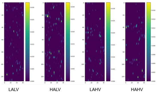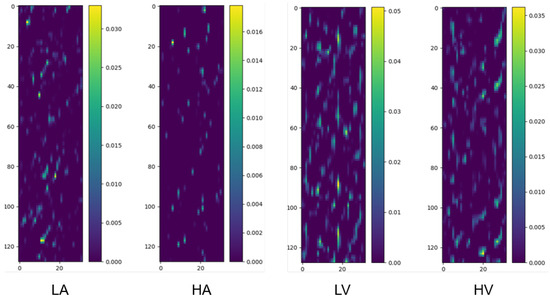 Class activation maps for binary classification tasks (Arousal: LA/HA; Valence: LV/HV). The y-axis corresponds to 32 EEG channels, ordered according to the numbering convention adopted in the preprocessed DEAP dataset, which is based on the international 10–20 system for electrode placement, and the x-axis represents 1 s time segments (128 samples at 128 Hz). Warmer colors denote regions with higher contribution to classification. Samples are randomly selected from the pooled dataset encompassing all participants, ensuring the observed patterns are not limited to specific individuals.