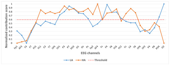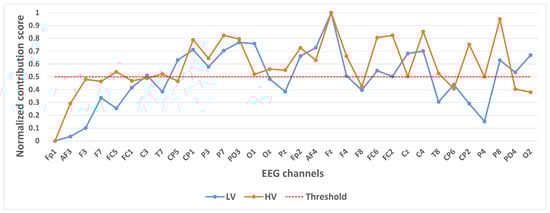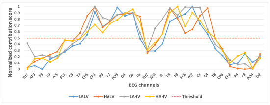 We took 14,000 samples under each category separately and plotted their category activation heat map. In order to analyze the contribution of different channels to the classification results, we take the mean value of each channel of the category activation heat map for each sample, and finally take the mean value of all the samples according to different categories and normalize them. These values were normalized to a 0–1 range to generate a Normalized Contribution Score, which reflects the relative importance of each channel in distinguishing emotional states. The results are shown in Figure 4, Figure 5 and Figure 6. The y-axis in these figures is labeled “Normalized Contribution Score”, where higher values indicate greater influence of the corresponding channel on the model’s classification decisions. This normalization ensures consistency across categories and tasks, facilitating the direct comparison of channel importance across different emotional classification scenarios.