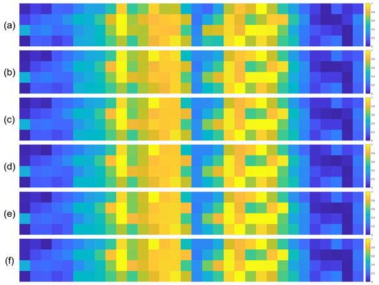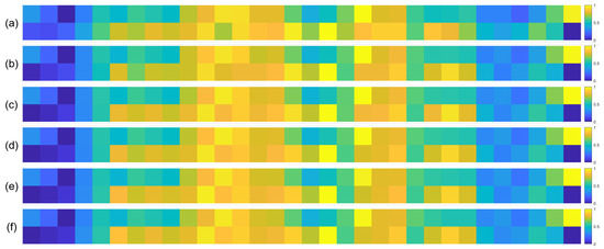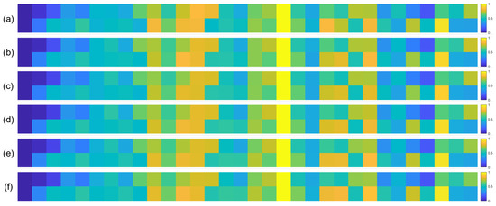 Heatmaps of normalized channel contribution values for six sample subset sizes under the binary classification task (Arousal), where subfigures (a–f) correspond to 1000, 3000, 5000, 7000, 10,000, and 14,000 samples, respectively. In each subplot, the horizontal axis represents the 32 EEG channels, and the vertical axis represents the emotional categories. Warmer colors indicate higher relative contributions of the corresponding channel to classification.