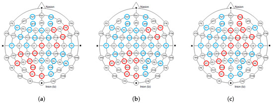 The distribution of electrodes that contribute significantly to classification under different tasks. The blue and red colors together mark the 32 electrode positions during the collection process in the international 10–20 system. The electrode positions that contribute significantly to classification are marked in red. (a) Quaternary classification task; (b) Binary classification task (Arousal); (c) Binary classification task (Valence).