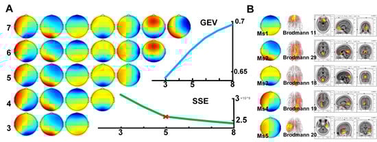 is the average potential value. GFP quantified the spatial electric field strength of the instantaneous topography map. Subsequently, the topographic maps corresponding to all local maxima of the GFP curve were extracted as “original maps” []. To obtain group-level microstate templates, these raw graphs were clustered using the AAHC algorithm, which does not consider polarity. During the clustering process, the global explanatory variance (GEV) was calculated at each step to determine the amount of variance in the entire dataset explained by the current template: