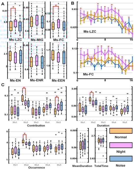 Microstate feature difference map. (A) Box plots of the complexity of six microstates under three conditions. (B) Line chart of the window complexity of LZC and FC, where the time window length is 1 s and the step size is 0.2 s. (C) Box plot of 5 conventional parameters for the five templates: contribution, duration, frequency of occurrence, average duration, and total time. * p < 0.05.