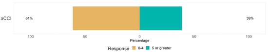 To facilitate analysis of the relationship between aCCI scores within our patient cohort, we performed a median split of the aCCI scores. The median aCCI value was 4, resulting in 114 patients (61%) with a aCCI of 0−4 and 72 patients (39%) with an aCCI of ≥5. This distribution is depicted in Figure 2. The distribution of every aCCI Index Weight was demonstrated in Figure S1 in the Supplement Materials.
