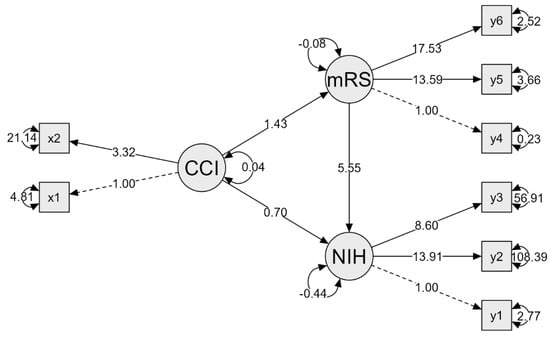 The SEM results indicated a direct path coefficient of 0.7 for the relationship between aCCI and the NIHSS at discharge, as well as between aCCI and the overall mRS at discharge, with a path coefficient of 1.43. These coefficients highlight the impact of aCCI on patient outcomes. Additionally, we used our hypothesized model to assess the indirect effect of aCCI on NIHSS at discharge via mRS. The indirect effect was calculated as the product of two path coefficients: the effect of aCCI on mRS (1.43) and the effect of mRS on NIHSS (5.56), resulting in an indirect effect value of 7.95 (1.43 + 5.56). The total effect of aCCI on NIHSS is the sum of both direct and indirect effects, reflecting the comprehensive impact of aCCI on NIHSS through both direct influence and mediation by mRS.