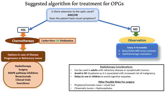 The current treatment options for OPG include observation, chemotherapy, RT, and surgery. Treatment decisions should be made by a multidisciplinary team, including pediatric oncologists, neuro-oncologists, neurosurgeons, ophthalmologists, and radiation oncologists, to ensure comprehensive care and minimize long-term adverse effects. Screening for NF–1 is essential for patients diagnosed with OPG. Figure 1 shows a suggested algorithm for treating OPGs.