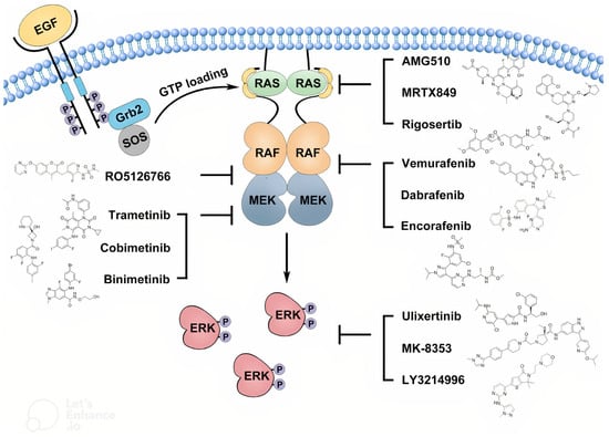 MAPK pathway and its inhibitors. Targeting the hyperactive Ras/RAF/MEK/ERK (MAPK) signaling pathway is a promising approach for cancer therapy. This signaling cascade operates downstream of RTKs. When RTKs bind to their ligands, they activate guanine exchange factors, such as Sos proteins, which facilitate the loading of GTP onto Ras GTPases. The GTP-bound Ras GTPases then recruit RAF/MEK heterodimers from the cytosol to the plasma membrane, where RAFs form transient tetramers through side-to-side dimerization. This dimerization activates RAFs, disrupts the RAF/MEK heterodimers, and promotes MEK homodimerization on the RAF dimer surface, leading to MEK activation by RAFs. Once activated, MEKs phosphorylate ERKs, which in turn phosphorylate various downstream effectors. In cancer cells, this pathway can become hyperactive due to mutations in Ras GTPases and BRAF. Such hyperactivity can be targeted with small-molecule inhibitors that specifically inhibit Ras G12C, BRAF(V600E), MEK, and ERK. Abbreviations: MAPK, mitogen-activated protein kinase; RAF, rapidly accelerated fibrosarcoma; RTKs, receptor tyrosine kinases. Copyright/license: This image has been borrowed from Yuan et al. [], which is an open-access article distributed under the terms and conditions of a Creative Commons license.