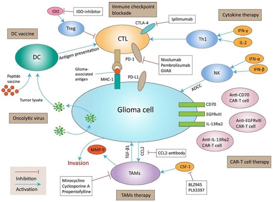 Current immunotherapy approaches for glioma. Oncolytic viruses have the ability to lyse glioma cells and subsequently release progeny viruses, which further assist in eradicating residual tumor masses. The tumor lysate released in this process can be identified by DCs, which are integral to DC vaccines. Dendritic cells are highly effective in presenting antigens and can activate CTLs, which then target and eliminate glioma cells. Glioma cells frequently evade immune detection by expressing immune checkpoint ligands such as PD–1, CTLA–4, and IDO. Blocking these checkpoints can significantly disrupt this immune evasion. Cytokines like IFN-γ and IL-2 are capable of activating Th1 cells, thereby enhancing CTL–mediated antitumor responses. Additionally, IFN-α and IFN-β can activate NK cells, which target tumor cells through ADCC. Glioma-associated antigens such as IL–13Rα2, EGFRvIII, and CD70 are expressed on tumor cell surfaces and can be recognized by CTLs with the enhancement of MHC–1 expression. Genetically engineered CAR T cells are targeting these antigens. Moreover, TAMs stimulated by CSF–1 and CCL2 can produce MMP–9 and TGF-β1, promoting glioma cell invasion. Inhibiting these pathways can help reduce glioma cell invasiveness. Abbreviations: ADCC, antibody-dependent cellular cytotoxicity; CAR, chimeric antigen receptor; CTLs, cytotoxic T lymphocytes; DCs, dendritic cells; IDO, indoleamine 2,3-Dioxygenase; NK, natural killer; TAMs, tumor-associated macrophages. Copyright/license: This image has been borrowed from Xu et al. [], which is an open-access article distributed under the terms and conditions of a CC BY-NC-ND 4.0 license.