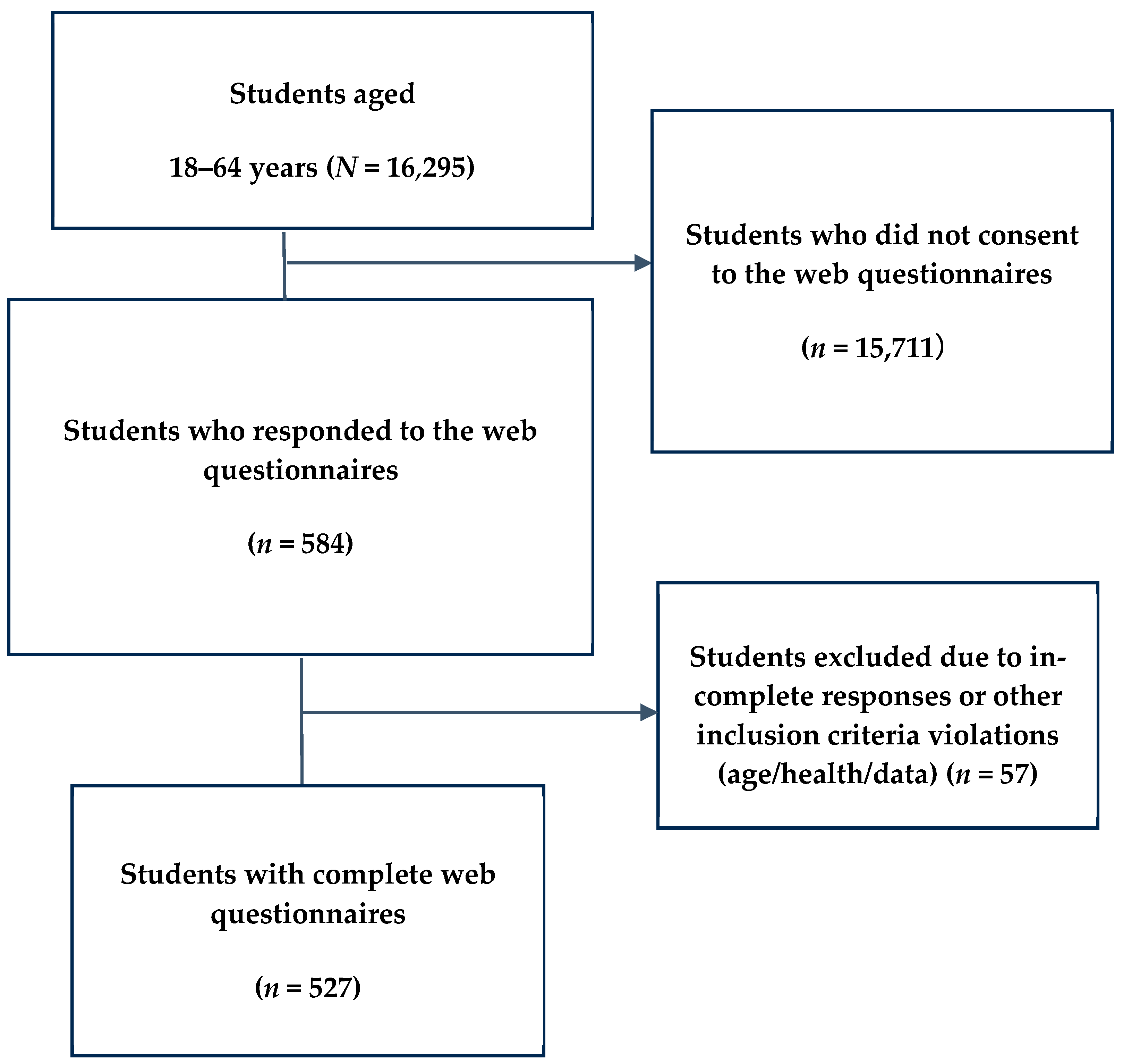 This cross-sectional study was conducted in April 2024. All undergraduate and graduate students (N = 16,295) of the National University A in Western Japan who had undergone annual health examinations were invited to participate in the study. The online survey was open for one month. Immediately after completing the health examination questionnaire, the students were redirected to a webpage inviting them to participate in the study. A total of 57 students were excluded from the analysis because they provided incomplete questionnaire responses or violated the inclusion criteria (age > 30 years, self-reported visual impairment or chronic illness, unspecified diagnosis, non-regular student status, or data inconsistencies). Consequently, 527 participants were included in the final analysis (Figure 1). Among these 527 participants, 6 students (1.1%) self-reported a prior clinical diagnosis of ADHD and 12 students (2.2%) reported a diagnosis of an autism-spectrum condition; diagnostic status was not used in inferential analyses because the study focused on self-reported trait-level difficulties.
