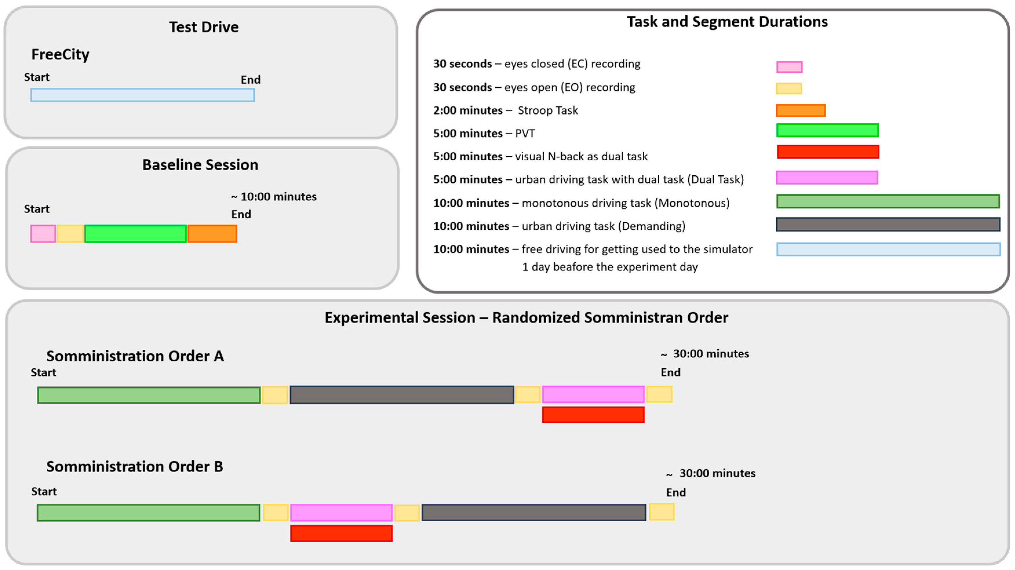 The order of the two demanding driving tasks (demanding and dual-task) was randomized to distinguish between effects due to exposure duration (time on task) and those related to task-specific workload. Additional eyes-open (EO) EEG recordings were collected between each driving session to monitor the progression of mental fatigue over time in rest conditions.