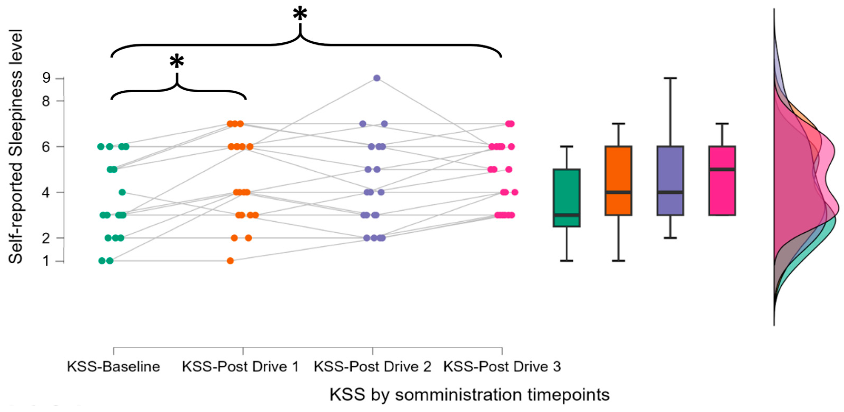 Post hoc analysis with Holm’s correction showed significant differences between the baseline KSS value (KSS-Baseline) and subsequent scores, especially after the first driving task, the monotonous one, (KSS-Post Drive 1, p = 0.043) and final driving task (KSS-Post Drive 3, p = 0.047). This suggests that participants experienced progressive mental fatigue over time.