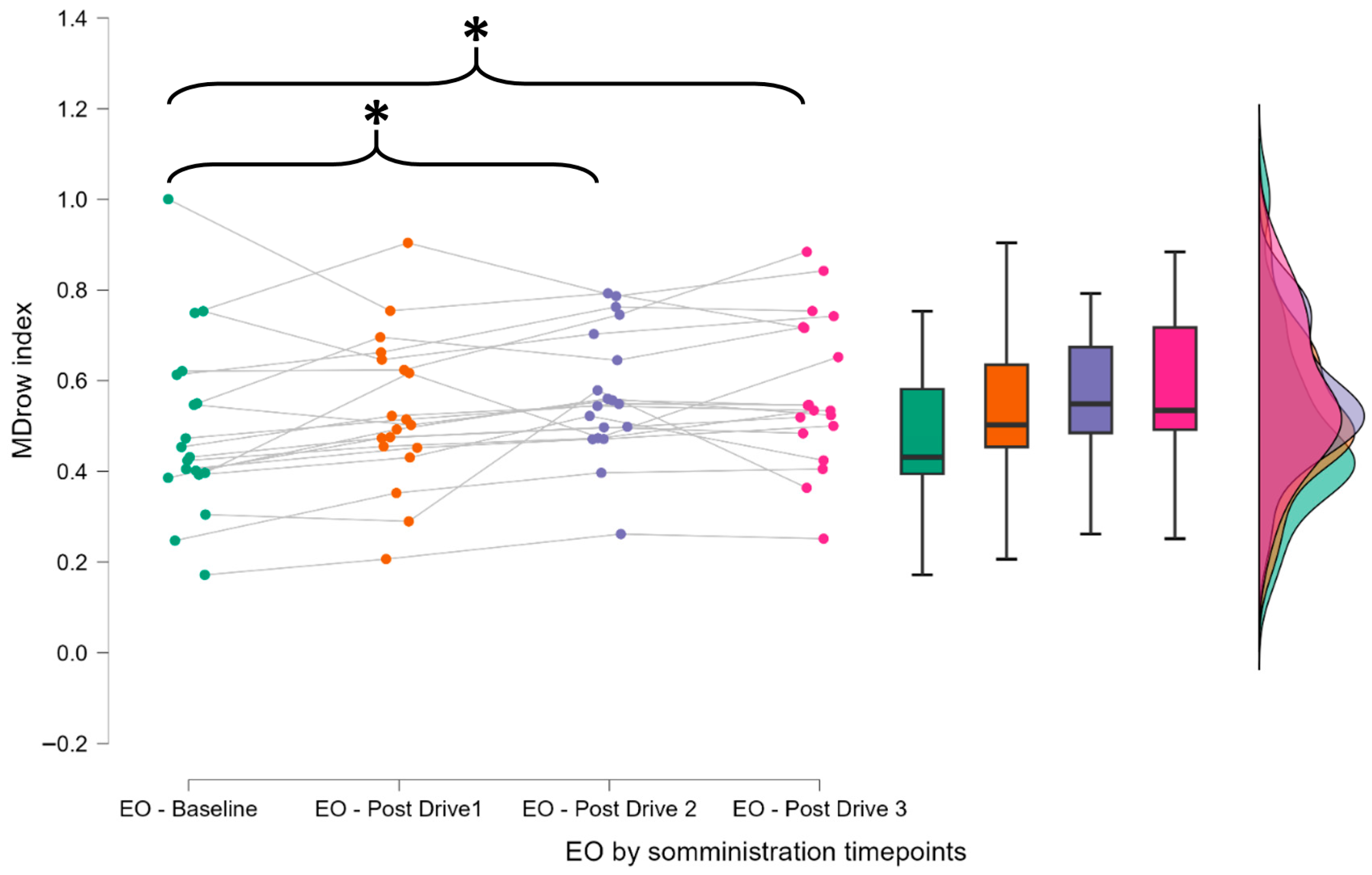 p < 0.001). Post hoc comparisons using the Holm correction indicated that significant increases in the index were observed between the EO baseline and EO after the second driving task (