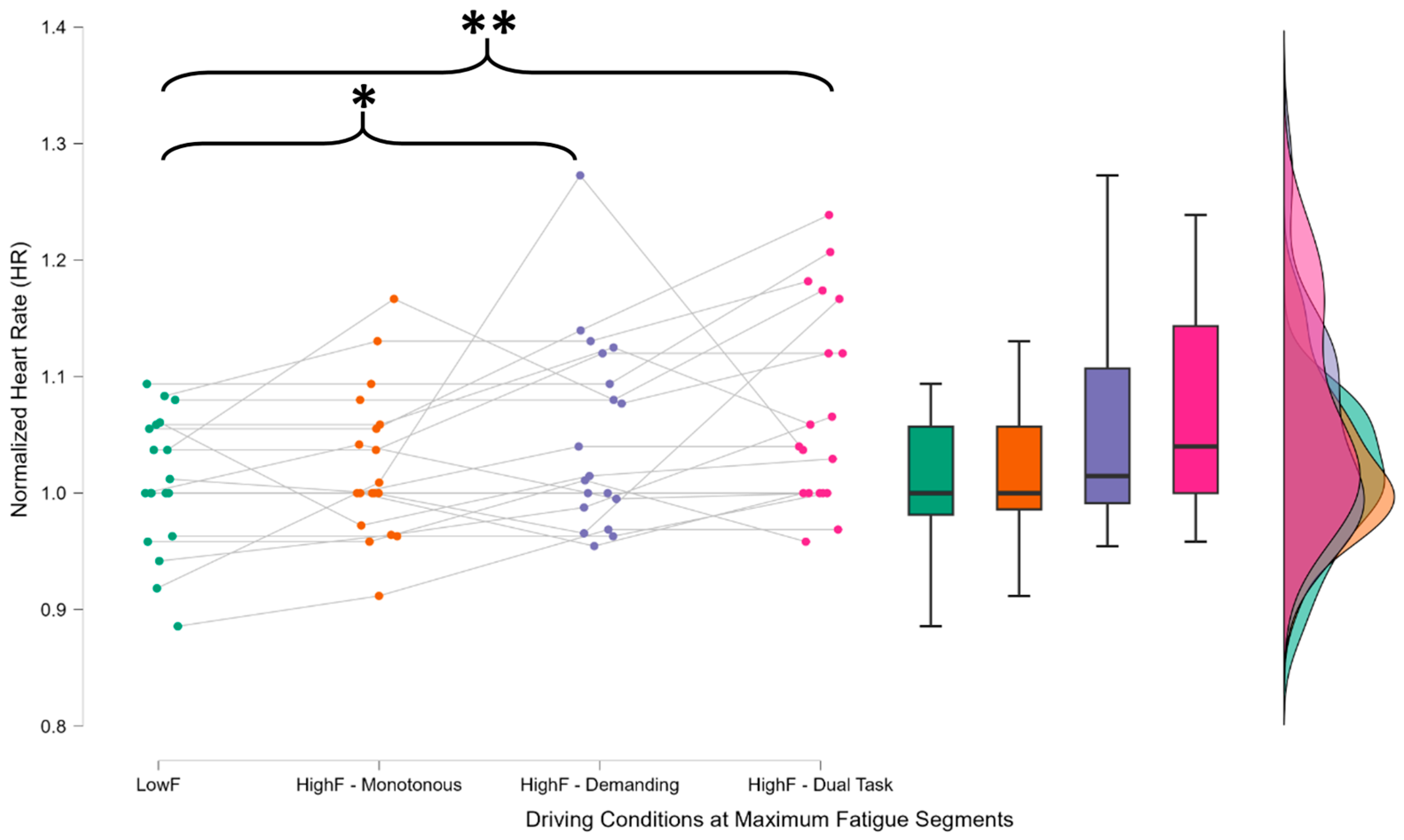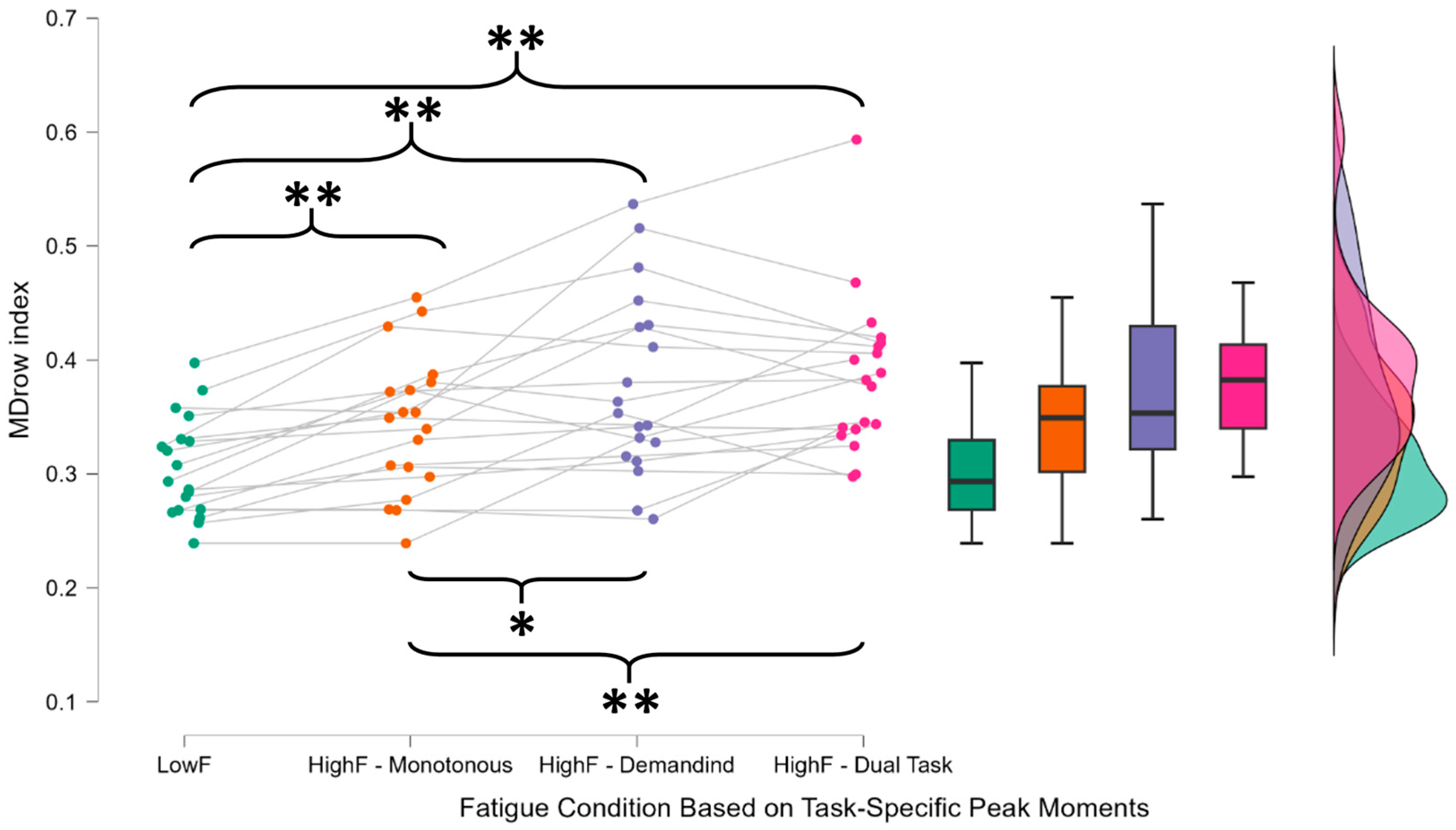 Subsequently, the Friedman test was used to compare LowF, HighF—Monotonous, HighF—Demanding, and HighF—Dual-Task, yielding a significant result (χ