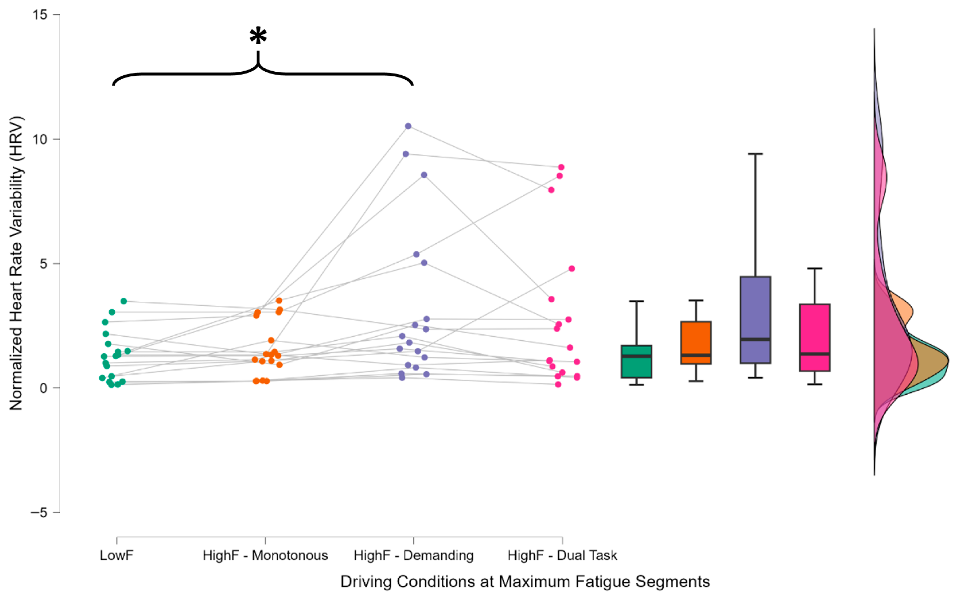 Accordingly, the absence of significant differences between LowF and HighF—Monotonous conditions supports the idea that HR and HRV primarily reflect mental engagement rather than accumulated mental fatigue, especially in the form of passive mental fatigue. These findings confirm that HR is more responsive to transient stress or effort, rather than to prolonged declines in vigilance [