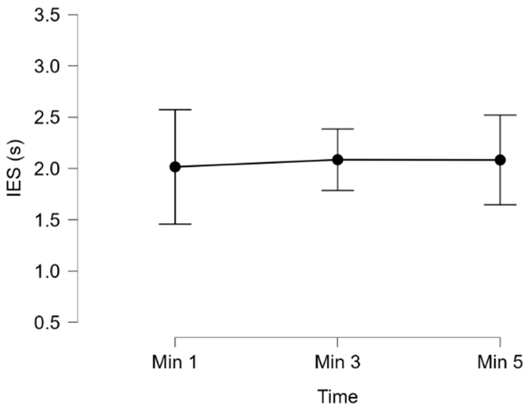 For each participant, the IES was calculated at the first, third, and fifth minutes of the Dual-Task condition, corresponding to the beginning, middle, and end of the task. Since the data were not normally distributed (all p < 0.05), a Friedman test was applied. The results revealed no significant effect of time (χ2 = 0.889; df = 2, p = 0.641; Kendall’s W = 0.049), confirming that participants consistently continued performing the secondary task for the entire duration.