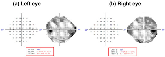 Visual field index (VFI) perimetry of the patient was obtained by standard automated perimetry (SAP) with a ZEISS Humphrey Field Analyzer 3™ (ZEISS, Jena, Germany). The 24-2 visual field test divides the central 24° into 54 threshold points. A light stimulus dims or brightens until the patient detects it, mapping retinal sensitivity across the near-periphery [5]. (a) Left eye: VFI24-2: 84%; MD24-2: −9.1 dB P < 0.5%; PSD24-2: 4.95 dB P < 0.5%. (b) Right eye: VFI24-2: 73%; MD24-2: −10.54 dB P < 0.5%; PSD24-2: 5.44 dB P < 0.5%. dB: decibel (indicates the light stimulus intensity that a patient can detect. This is a logarithmic scale, where higher dB values indicate greater sensitivity to light). MD: mean deviation. PSD: pattern standard deviation.