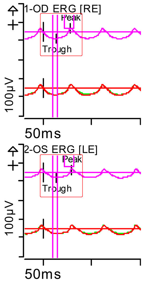- Robson, A.G.; Frishman, L.J.; Grigg, J.; Hamilton, R.; Jeffrey, B.G.; Kondo, M.; Li, S.; McCulloch, D.L. ISCEV Standard for full-field clinical electroretinography (2022 Update). Doc. Ophthalmol. 2022, 144, 165–177. [Google Scholar] [CrossRef] [PubMed]