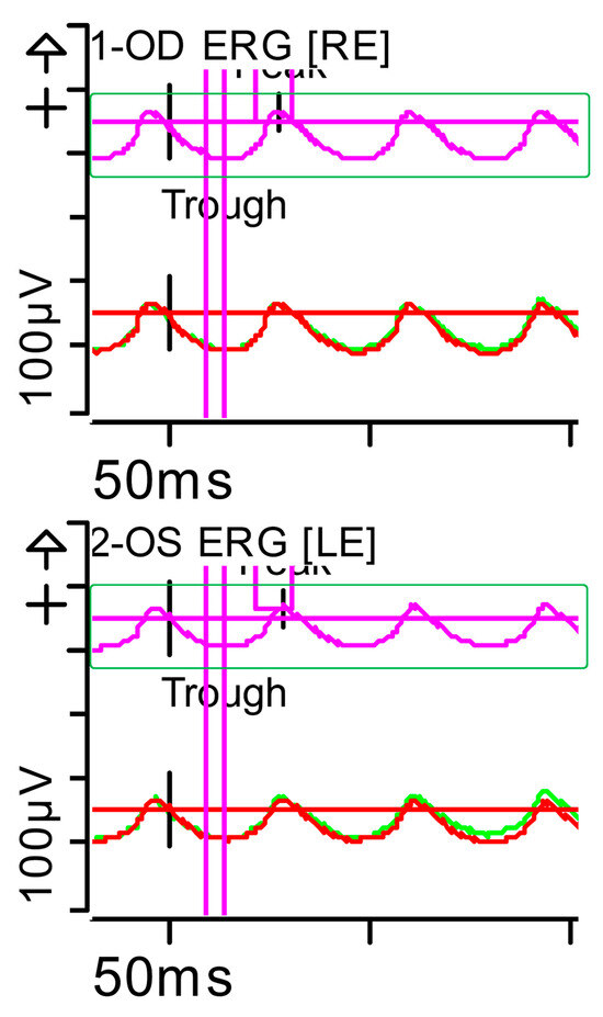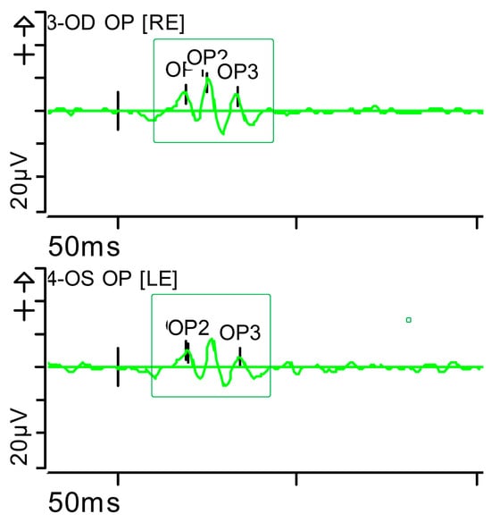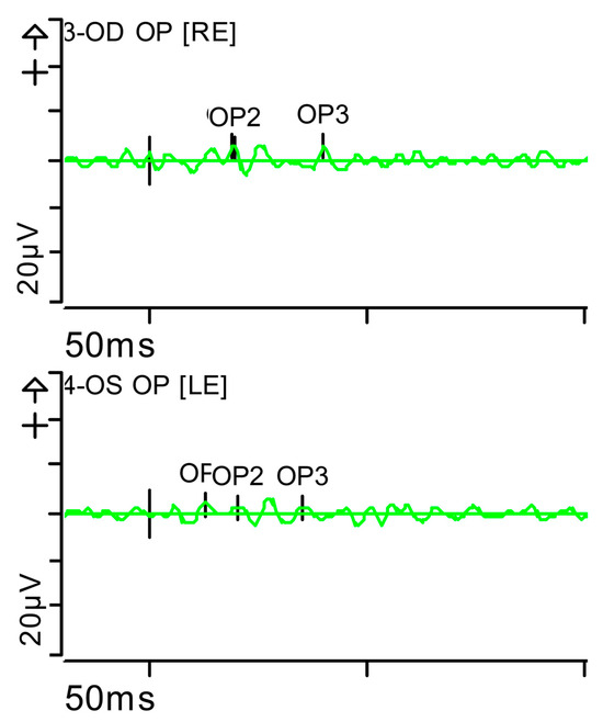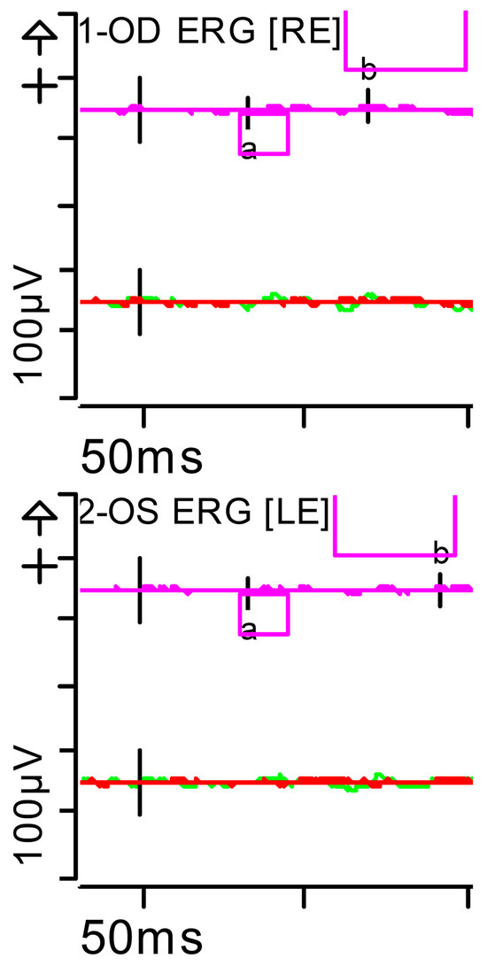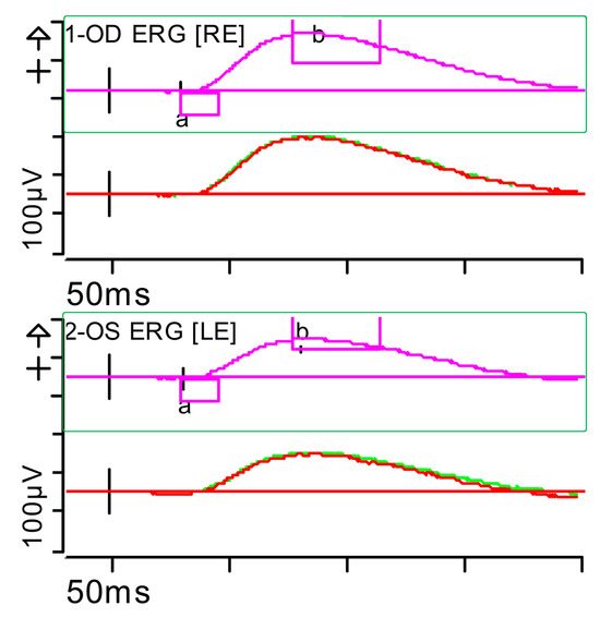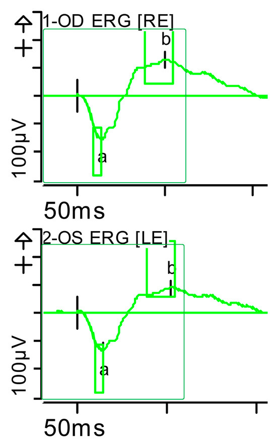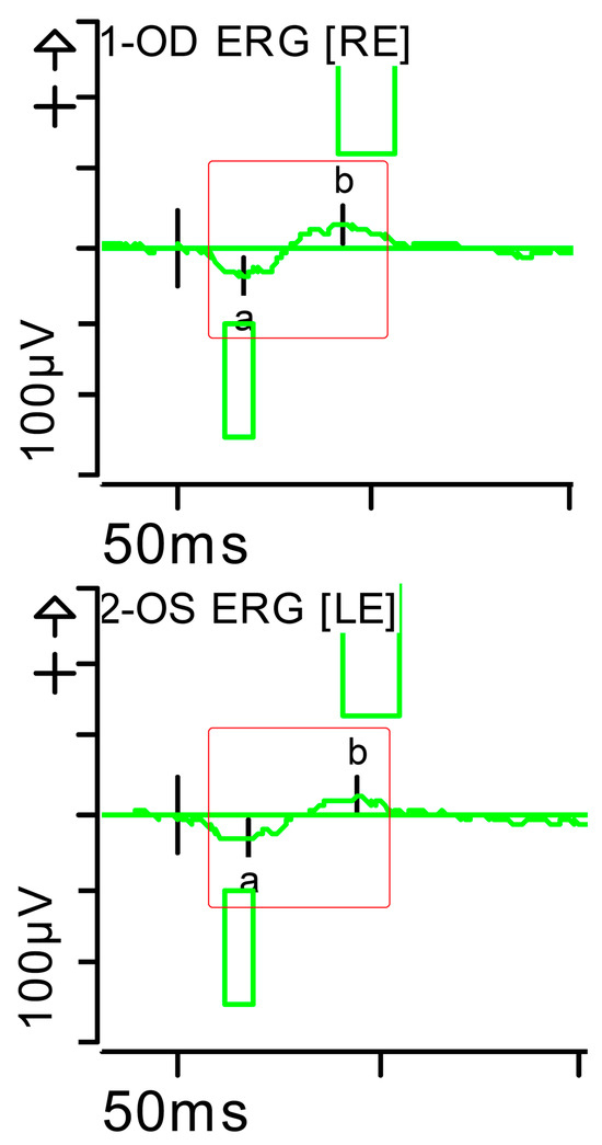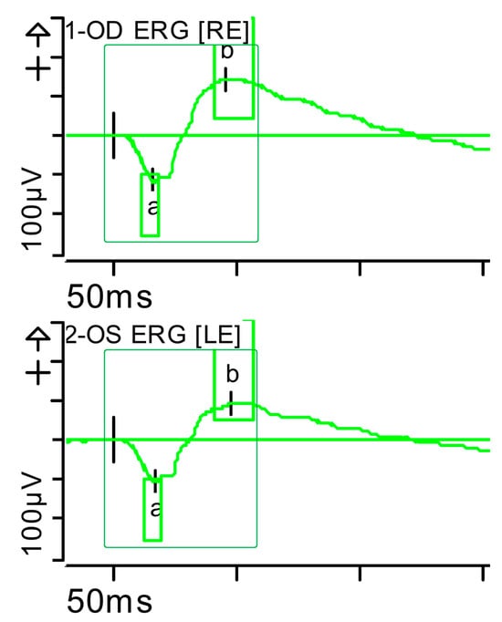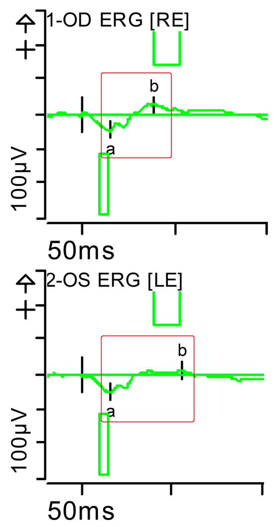 The ERG was performed in adherence with International Society for Clinical Electrophysiology of Vision (ISCEV) standards parameters (2022 update) [8], with pupil dilation and an ocular electrode (HK-LOOP type) in each eye, with a Diagnosys Red Profile™ System Espion using a ColorDome Stimulator™ and Espion™ software V6.66. Luminance dose is expressed in (P) (photopic units) candelas per second per square metre (cd·s·m−2). This showed a very significant alteration in responses under scotopic conditions (indicative of severe involvement of the bilateral peripheral retina [rods and ON-type bipolar cells]) and, to a lesser extent, under photopic conditions (mild involvement of the bilateral central retina [cones]). Inner retinal function, measured by oscillatory potentials generated by amacrine cells, was also reduced (Figure 2, Figure 3, Figure 4, Figure 5, Figure 6 and Figure 7 show the ERGs at presentation, i.e., before treatment). It is worth clarifying that, according to the current ISCEV (2022) standard, the b-wave response is driven primarily by the rod-driven ON-type bipolar cells [9], so the reduced rod-driven response would occur in the rod bipolar cells that are exclusively ON-type.