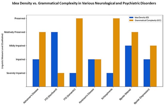 Table 1. A comparative analysis of Idea Density (ID) and Grammatical Complexity (GC) across their core definitions, measurement techniques, primary neurobiological substrates, and cognitive demands and the linguistic impact of brain damage. This table highlights the fundamental distinctions between these two neurocognitive markers. All abbreviations are defined as follows: ATL: Anterior Temporal Lobe; BA: Brodmann Area; CPIDR: Computerized Propositional ID Rater; dlPFC: Dorsolateral Prefrontal Cortex; GC: Grammatical Complexity; ID: Idea Density; MLU: Mean Length of Utterance; TPJ: Temporal–Parietal Junction.