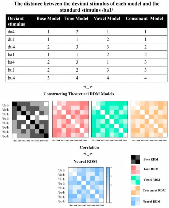 Representational Similarity Analysis (RSA) has been effectively applied in prior studies to decode different linguistic feature representations, such as decoding multidimensional phonological representations and feature integration in language processing [77,78,79]. To investigate how different speech features (tone, vowel, consonant) are neurally represented and whether individuals with ASD exhibit altered feature integration, we perform RSA based on ERP data. Integration Complexity Models are constructed to quantify the dissimilarity stimuli (see Figure 3). Each model operationalizes dissimilarity between stimulus pairs as a function of changes in three phonological features: Tone, Vowel, and Consonant. The models differ in their weighting schemes to emphasize specific features, reflecting theoretical assumptions about their relative perceptual or cognitive salience. Below is a detailed description of each model: