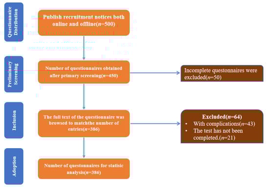 Thus, a minimum of 384 participants was required. To account for potential low response rates and data loss, we targeted 500–600 elderly women to enhance reliability and statistical power [21]. The questionnaire’s overall Cronbach’s α coefficient was 0.81, indicating acceptable internal consistency [22]. Ultimately, 500 questionnaires were collected, with 386 deemed valid. Stratified sampling was used to ensure representation across age groups (60–64, 65–69, 70–74 years) and exercise types. The final sample size (n = 386) exceeded the minimum requirement (n = 384), ensuring sufficient statistical power for primary analyses (Figure 1).