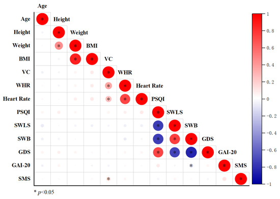 Correlation analysis of physiological indicators, sleep quality, and psychological variables in the elderly participants. Body Mass Index: BMI, Vital Capacity: VC, Waist–Hip Rate: WHR, Pittsburgh Sleep Quality Index: PSQI, Satisfaction with Life Scale: SWLS, Subjective Well-Being: SWB, Geriatric Depression Scale: GDS, Geriatric Anxiety Inventory-20: GAI-20, and Sport Motivation Scale: SMS.