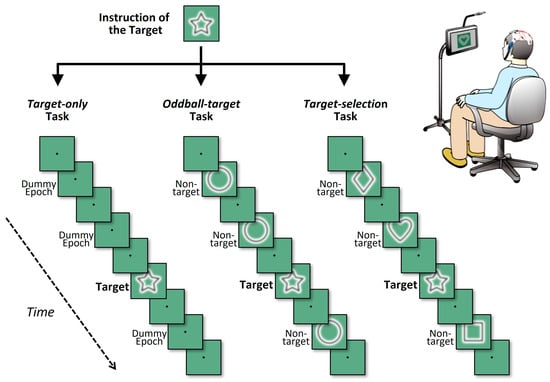 To systematically investigate neural responses under varying cognitive demands, three types of tasks were administered: Target-only, Oddball-target, and Target-selection [61]. In all tasks, eight types of simple geometric shapes (e.g., circle, square, triangle, star) were used as targets or non-targets. Across all tasks, a common temporal and structural format was used: each task consisted of eight “games,” and each game comprised six consecutive “blocks.” Within a game, one specific geometric shape was designated as the target, which remained constant throughout the six blocks. The participants were informed of the designated target shape prior to the start of each game. Each block included eight stimulus cycles (hereafter referred to as “trials”), in which a single target stimulus and seven non-target stimuli or equivalent dummy trials were presented in pseudorandom order. To ensure balanced cognitive processing, the temporal position of the target within each block was pseudorandomized with the constraint that it could not appear within the first two trials. For ERP analysis, target waveforms for each participant were obtained by averaging all target trials within each game condition. Given that each task consisted of eight games with six target trials per game, a total of 48 target trials per task (6 × 8) were integrated, providing a sufficient number of epochs to yield robust P300 signals.